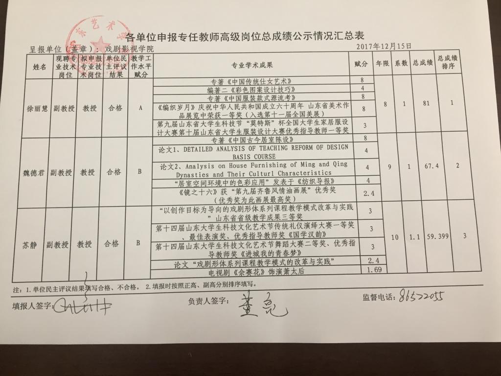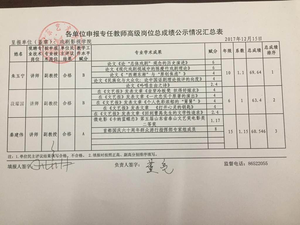 戏剧影视学院2017申报专任教师高级岗位总成绩公示情况汇总表