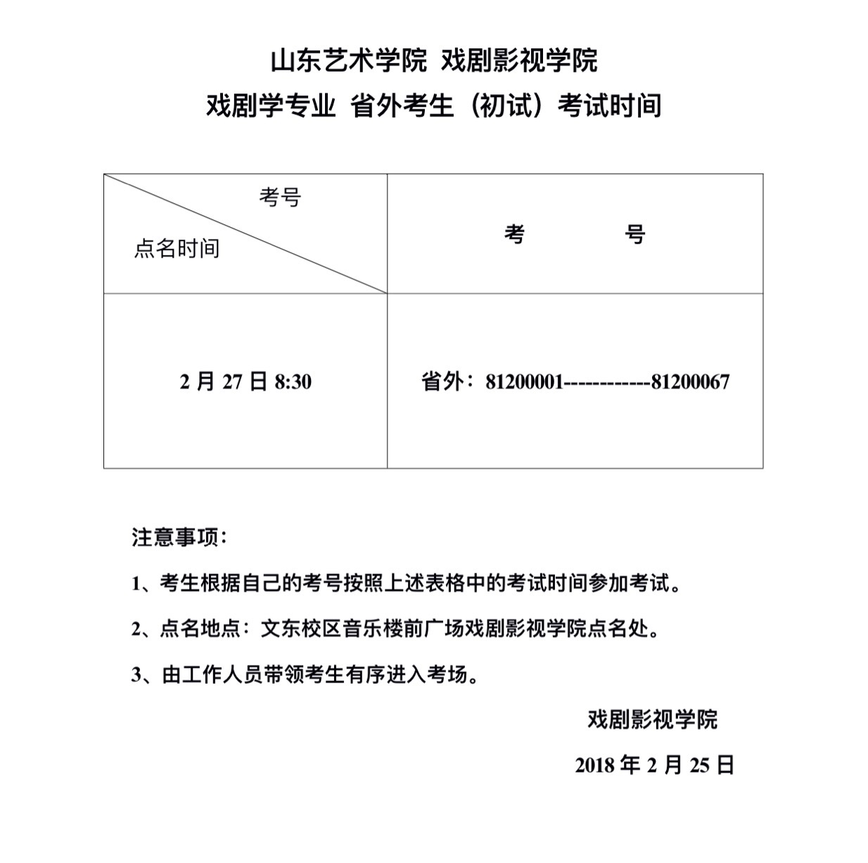 山东艺术学院戏剧影视学院戏剧学专业省外考生(初试)考试时间