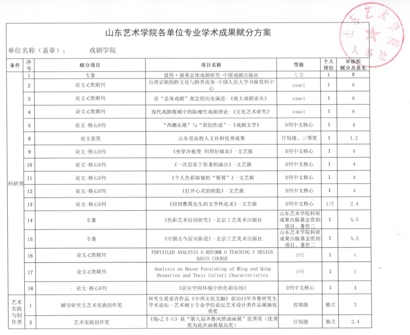 山东艺术学院各单位专业学术成果赋分方案——戏剧学院