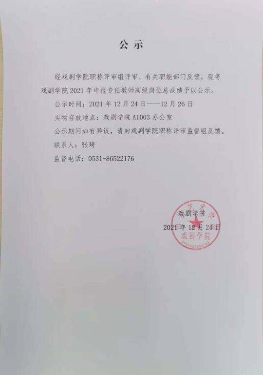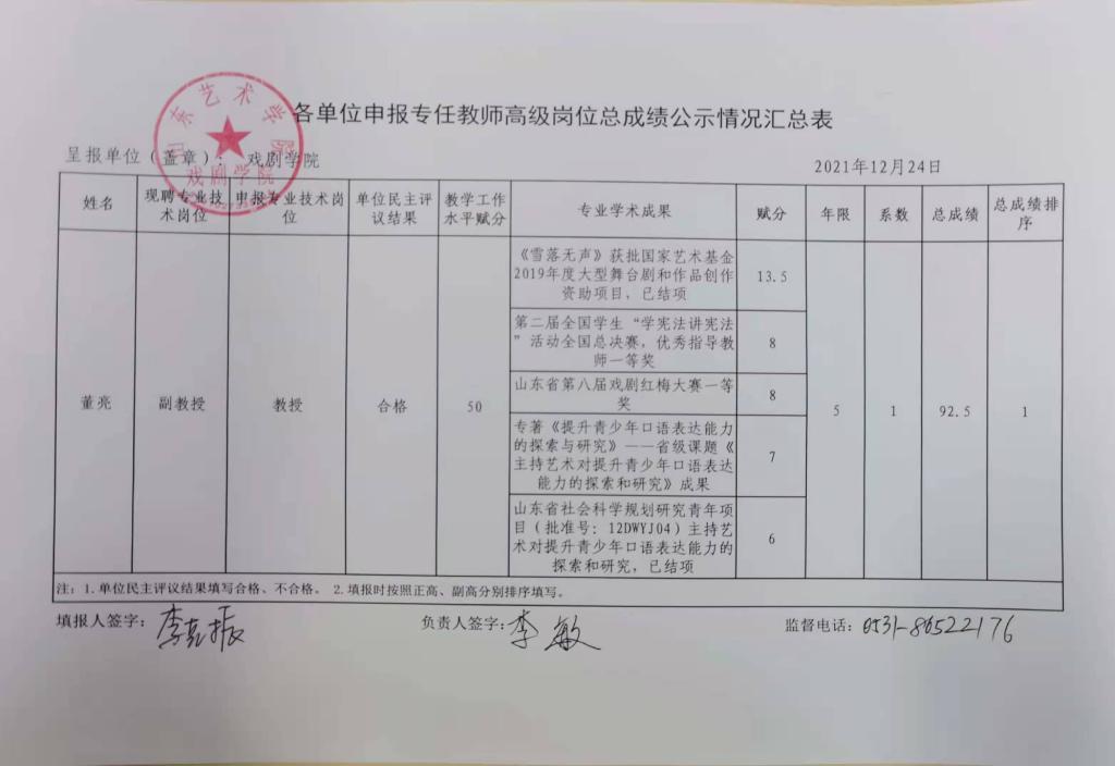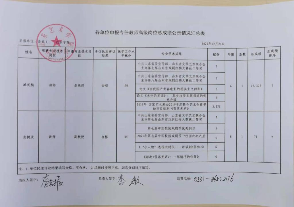 戏剧学院申报专任教师高级岗位总成绩公示情况汇总