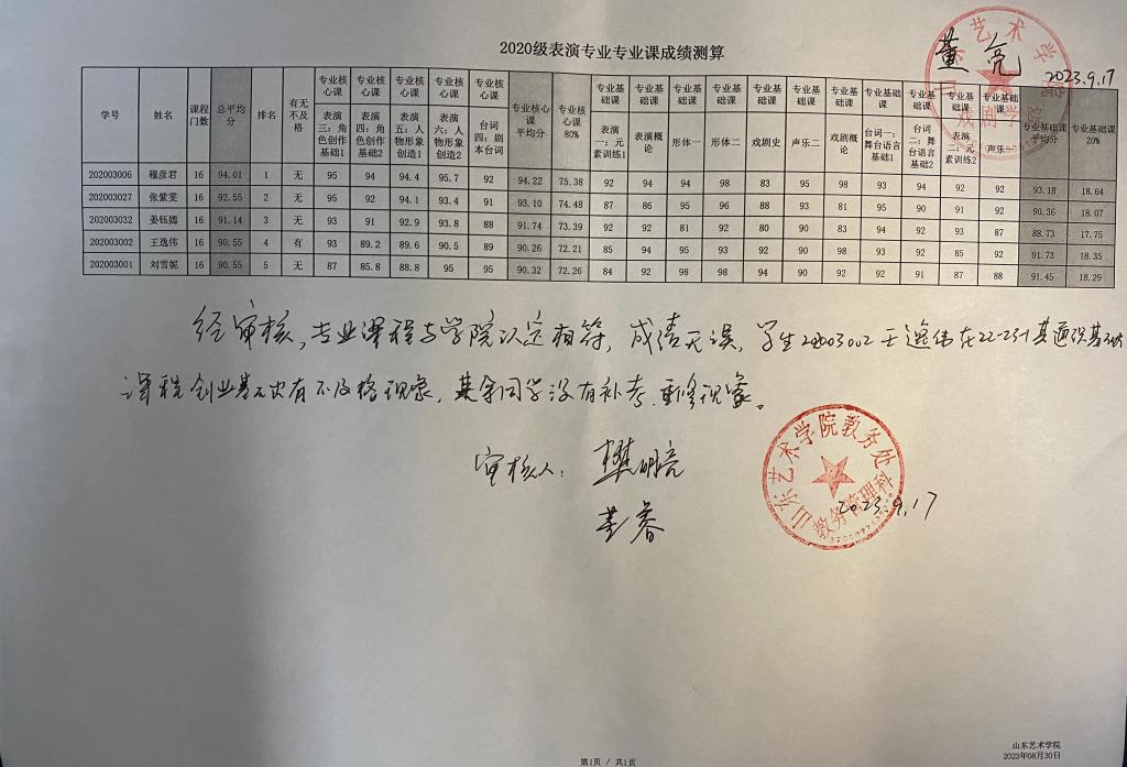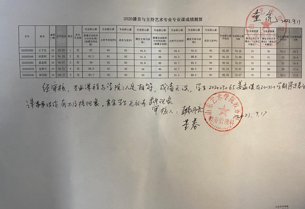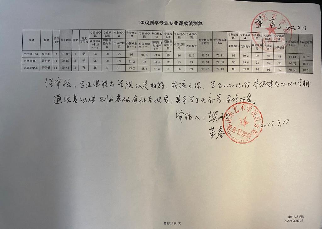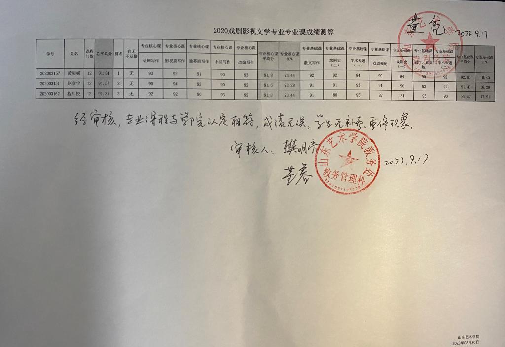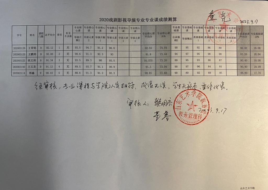 戏剧学院2020级各专业专业课成绩测算公示