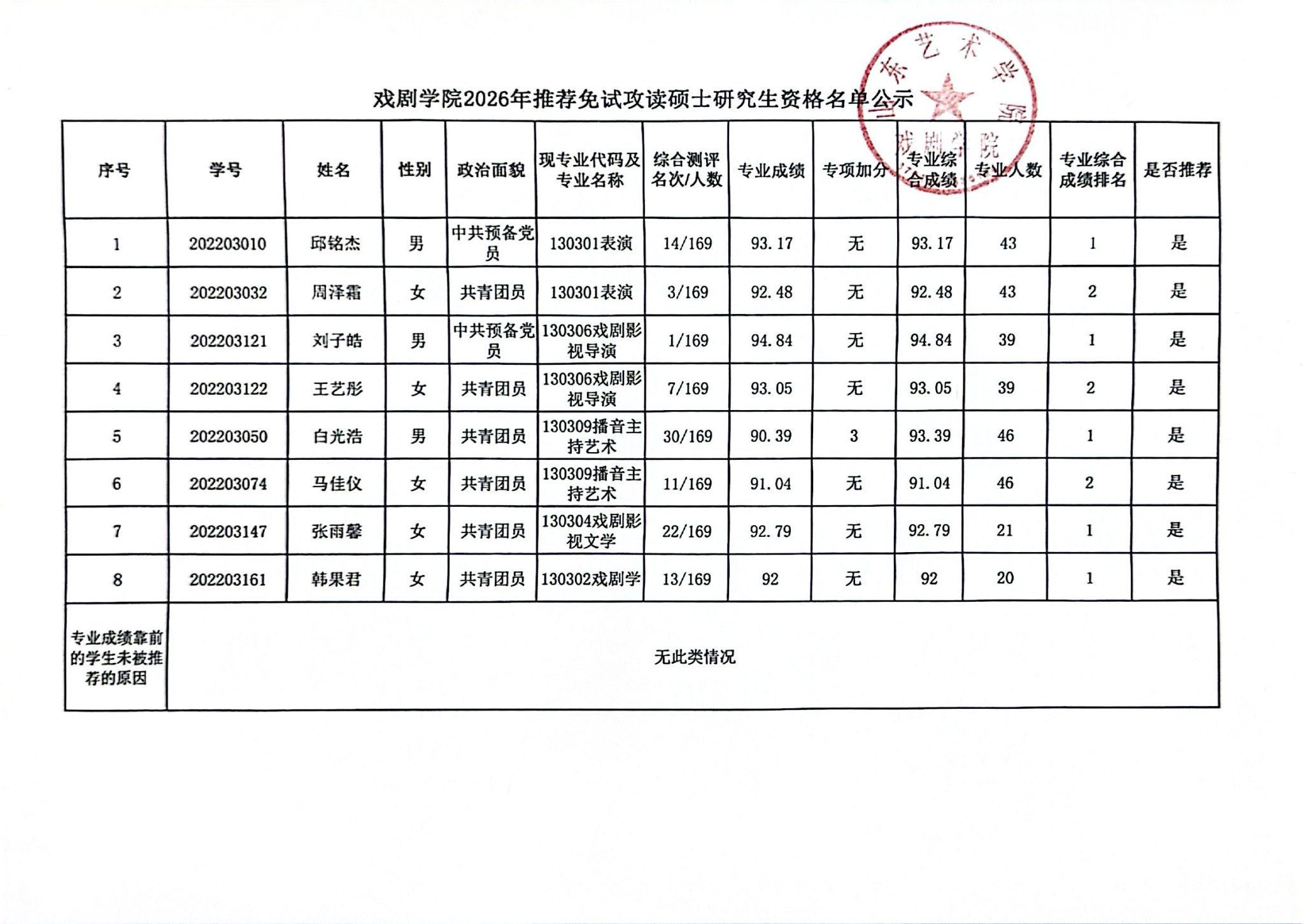 戏剧学院2026年推荐免试攻读硕士研究生资格名单公示