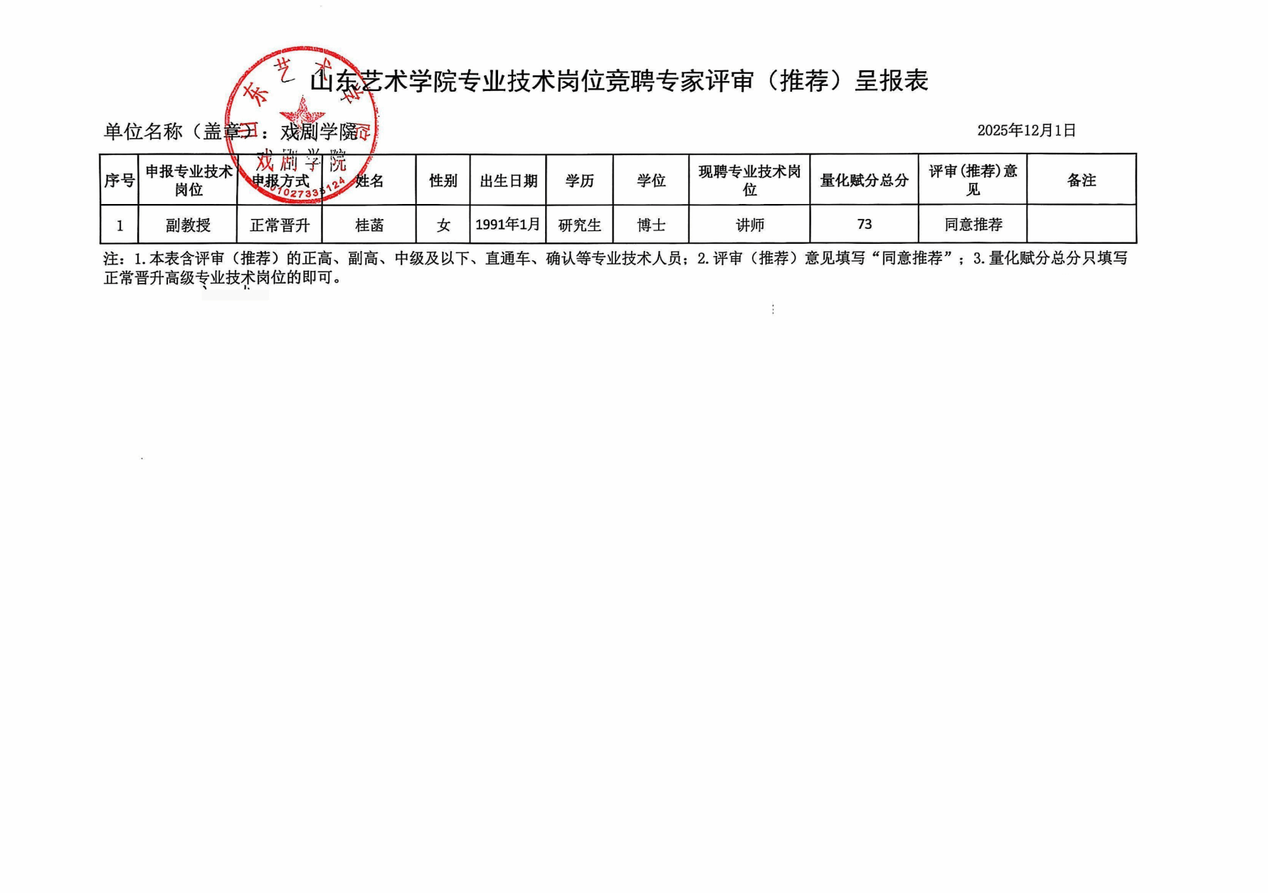戏剧学院2024年度专任教师岗位竞聘专家评审(推荐)呈报表线下公示地址:戏剧学院A栋宣传栏。参评人员评聘原件材料公示地址:戏剧学院A1004办公室。公示期为5个工作日(2025年12月1日至5日),如有异议,请于公示期内联系监督电话: 0531-86522052。