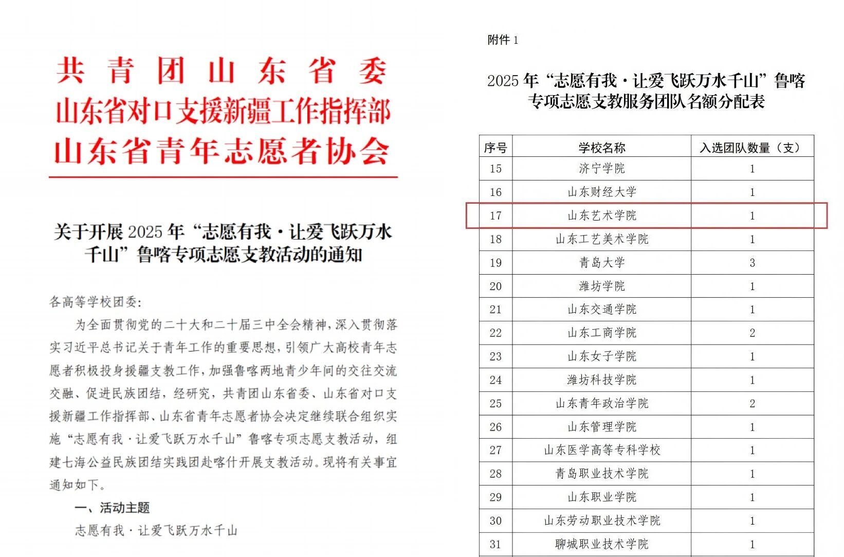 为全面贯彻党的二十大和二十届三中全会精神,深入贯彻落实习近平总书记关于青年工作的重要思想,引领广大高校青年志愿者积极投身援疆支教工作,加强鲁喀两地青少年间的交往交流交融、促进民族团结,共青团山东省委、山东省对口支援援藏工作指挥部、山东省青年志愿者协会联合组织开展“志愿有我·让爱飞跃万水千山”鲁喀专项志愿支教活动,山东艺术学院“亮音”语言艺术志愿服务队成功入选。