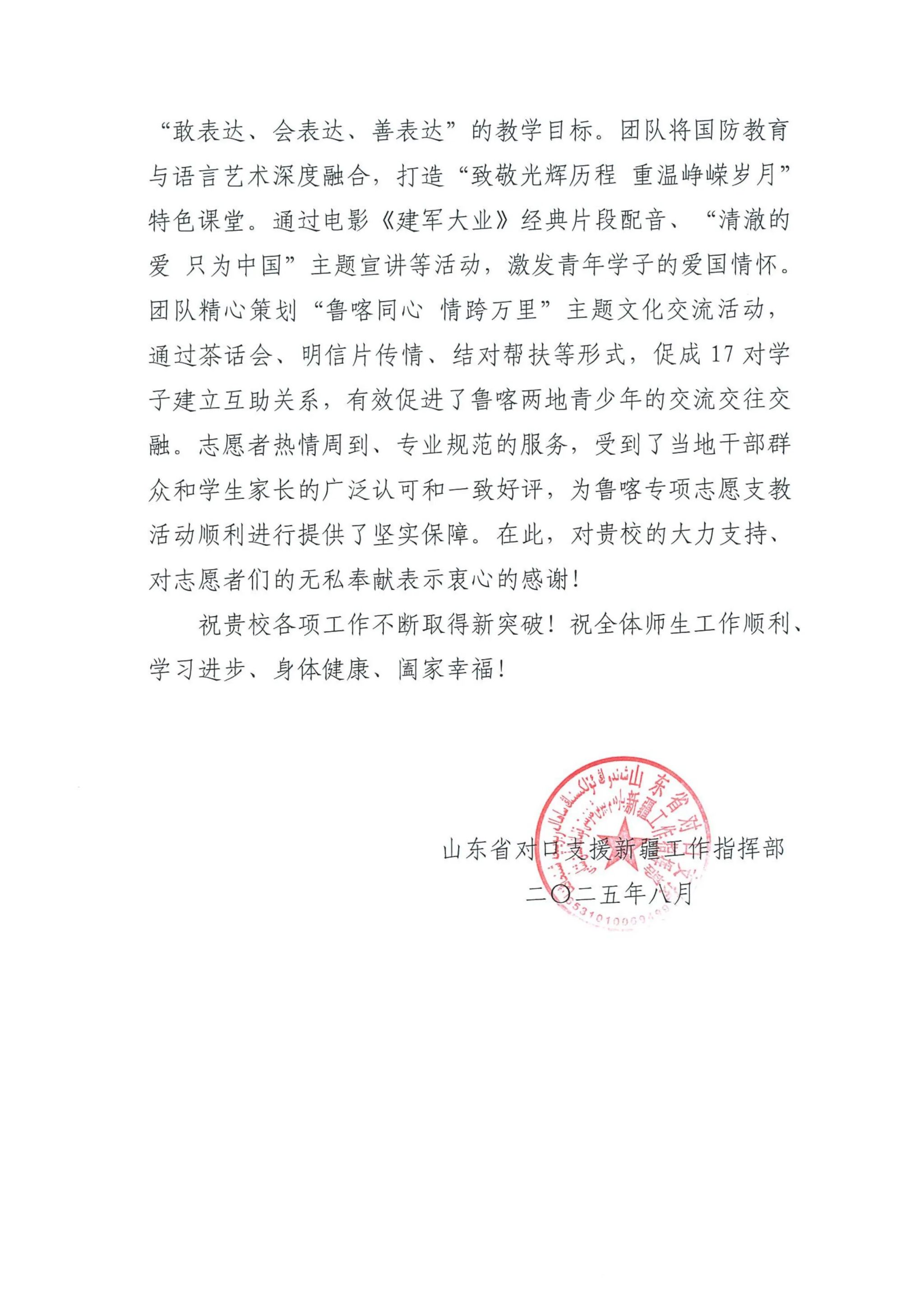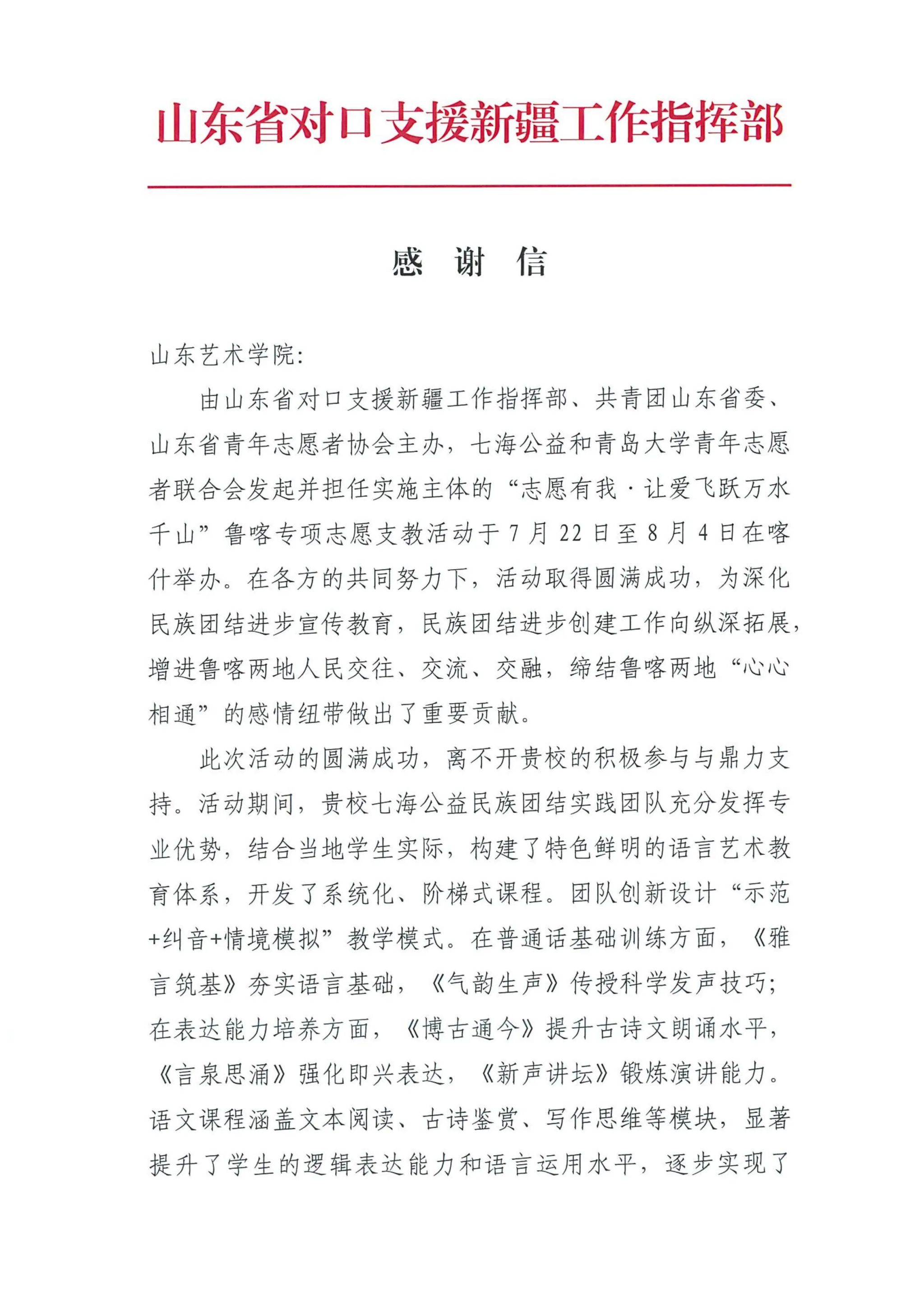 近日,我院收到来自山东省对口支援新疆工作指挥部的感谢信,信中对山东艺术学院“亮音”语言艺术志愿服务队在2025年“志愿有我·让爱飞跃万水千山”鲁喀专项志愿支教活动中的积极参与和突出贡献致以衷心感谢。这封承载着跨越山海情谊的信件,不仅是对我院志愿服务工作的高度肯定,更是对立德树人成效和社会服务能力的充分认可。