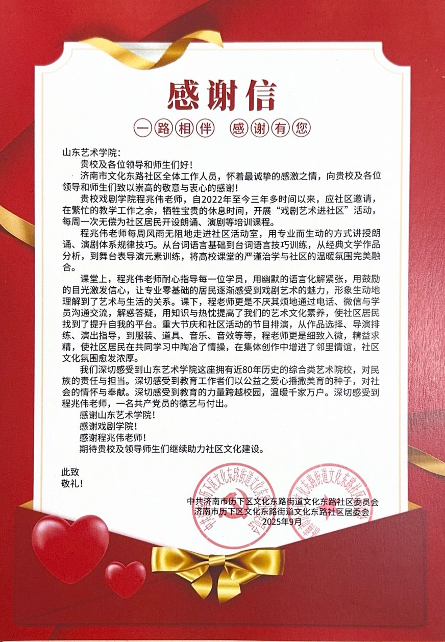 近日,我院收到济南市历下区文化东路社区发来的感谢信,信中对我院教师程兆伟持续三年开展的“戏剧艺术进社区”公益活动表达了诚挚谢意。