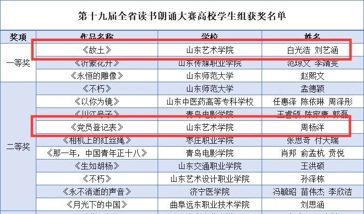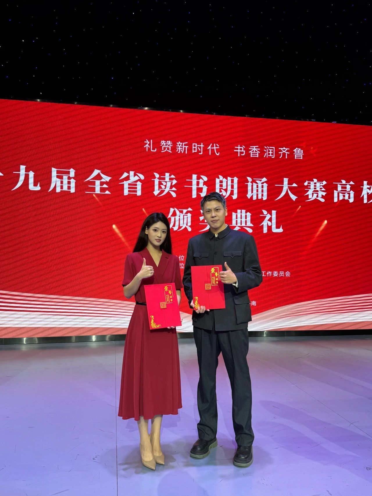 9月14日,由山东省文化和旅游厅主办,山东省图书馆、山东省高等学校图书情报工作委员会、山东师范大学图书馆联合承办的“礼赞新时代·书香润齐鲁”第十九届全省读书朗诵大赛高校学生组决赛圆满落幕。由山东艺术学院戏剧学院院长董亮教授指导,2023级研究生刘艺涵与2022级播音与主持艺术专业本科生白光浩参赛作品《故土》荣获一等奖;由山东艺术学院戏剧学院外聘硕士研究生导师刘元鸣指导,2022级研究生周杨洋参赛作品《党员登记表》荣获二等奖。