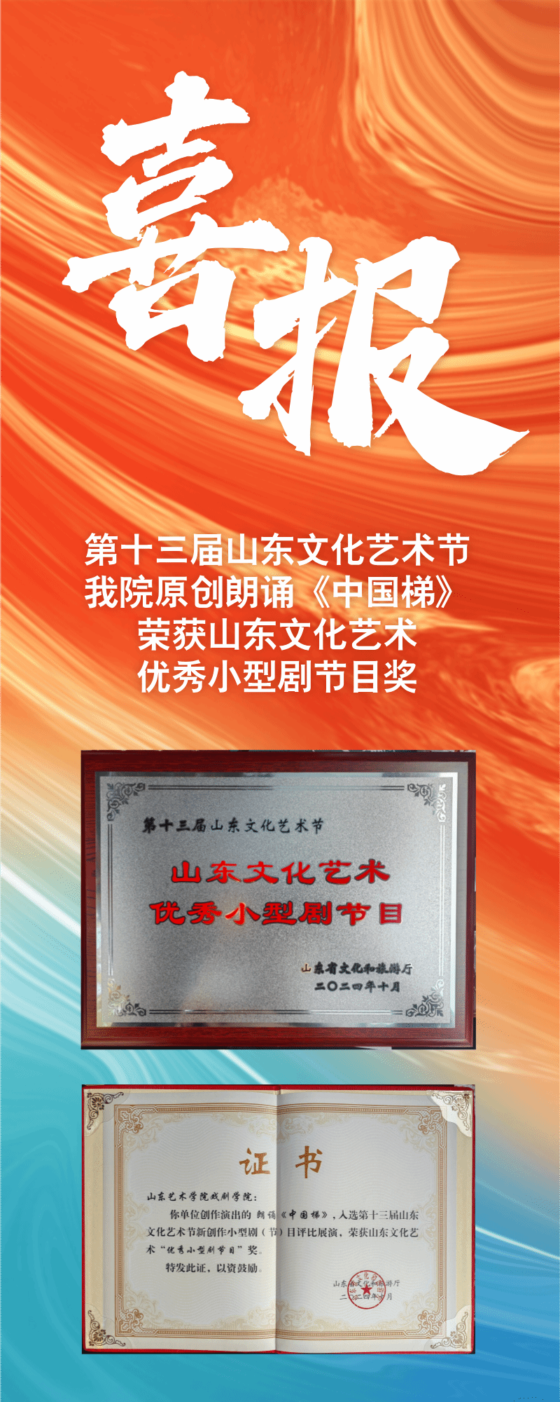我院原创朗诵《中国梯》精彩亮相第十三届山东文化艺术节新创作小型剧(节)目评比展演,荣获山东文化艺术“优秀小型剧节目”奖。