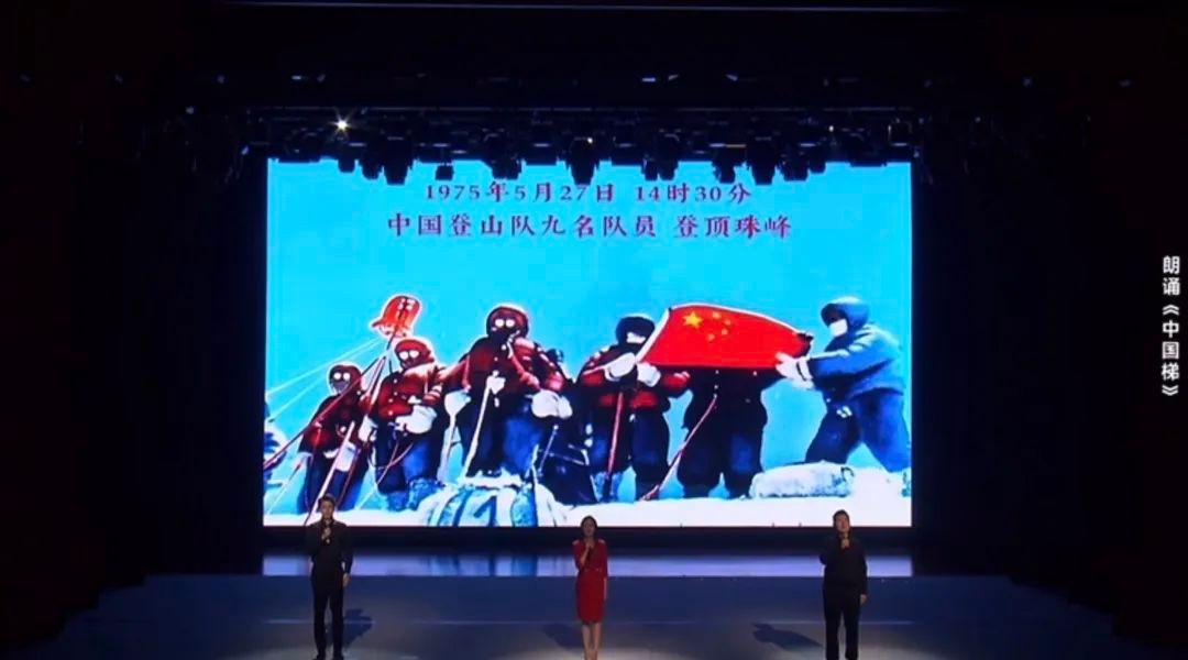 朗诵《中国梯》由戏剧学院院长董亮教授与2022级研究生赵妍琦、2023级研究生朱德朋、2022级播音与主持艺术专业本科生白光浩根据真实事件创作演出。该作品讲述了一段奋力拼搏、挑战极限的动人故事:1960年,由王富洲、屈银华等人组成的中国登山队成功登顶珠穆朗玛峰,却因未留下照片而不被国际承认。历经4年的准备,登山队再次集结,经过不懈的努力、克服种种困难最终成功登顶,并在号称不可逾越的“第二台阶”断崖处搭建起一架登山梯。这架梯子不仅帮助了中国登山队成功登顶,在此后的30年间还帮助了来自世界各地的1300余名登山者登顶珠峰,而这架梯子被誉为“中国梯”。