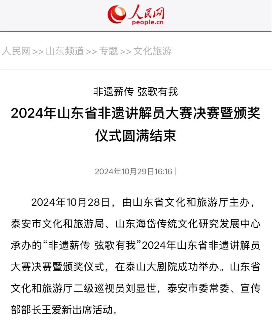 大赛结束后,人民网、中国新闻网、文旅中国、文旅山东、齐鲁壹点、网易新闻等多家媒体对本次比赛进行报道,不仅表现出社会各界对本次比赛的关注,更体现了非遗传承在当今社会的重要性。此次大赛意义深远,展现了山东省丰富的非遗资源和动人的非遗故事,选拔了一批才华横溢的非遗讲述者与“代言人”,为非遗的薪火相传注入了新鲜血液。